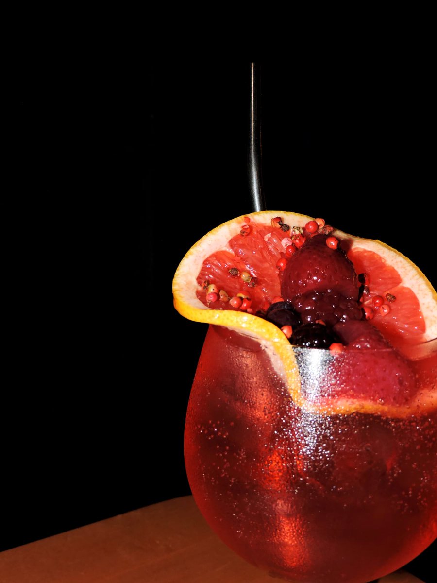 Boca Roja: gin Blu, tónica, syrup de frutos rojos, rodaja de pomelo y pimienta rosa