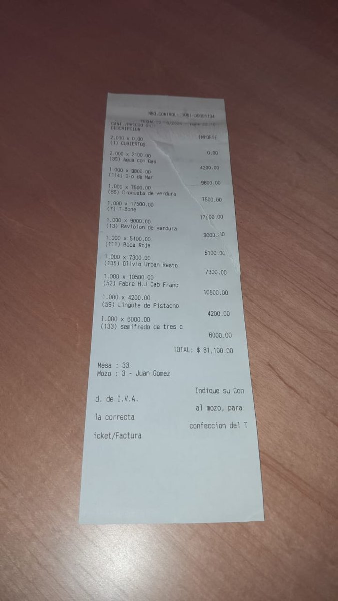 Tomamos un HJ Fabre, gama media. Blend malbec 80% cabernet franc 20%. Buen maridaje con el corte de carne. Estaba a buen precio para ser un restaurante: $10.500
