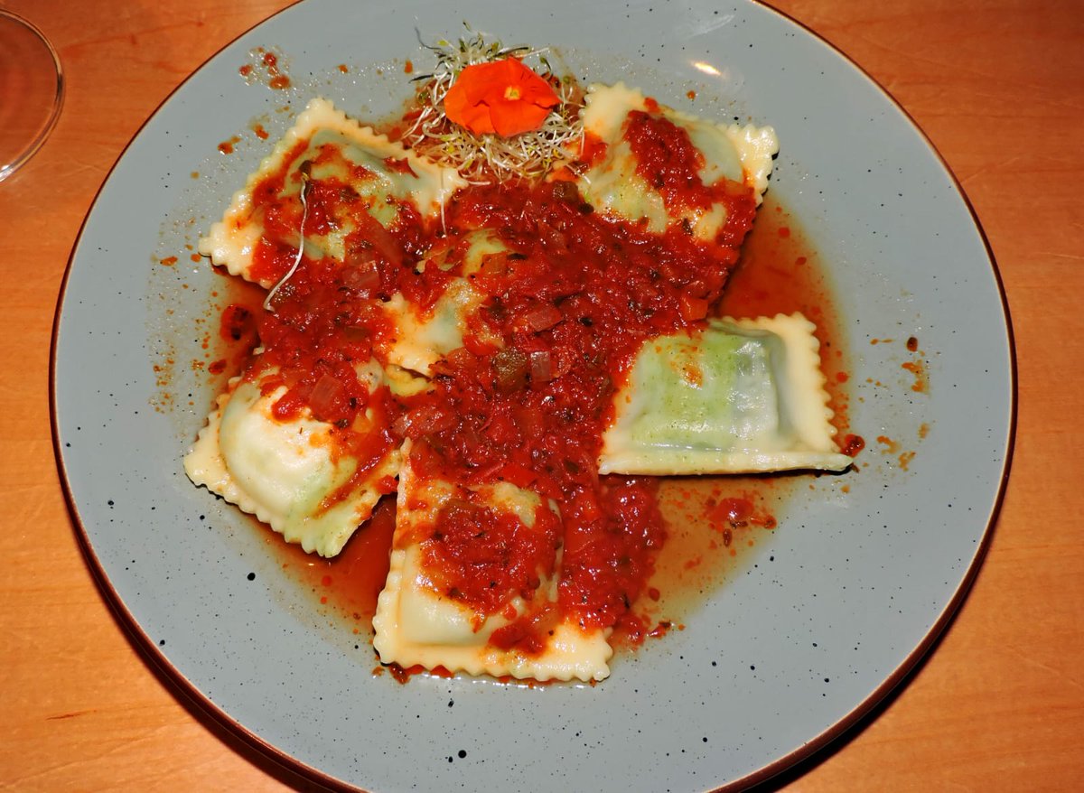 Raviolón de verdura bicolor con salsa scarparo. Cumplió sin ninguna locura.