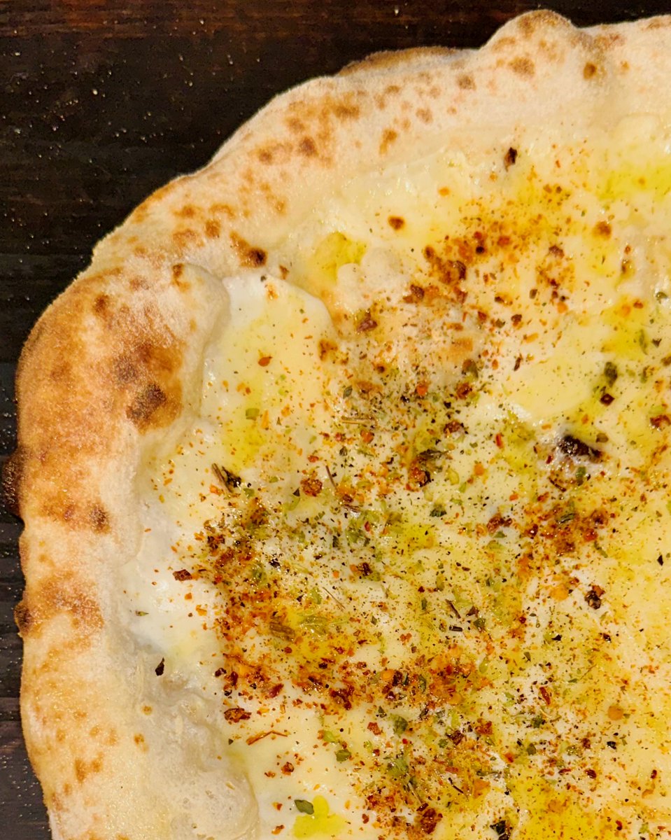 La Gina toda de queso: muzza, parmesano y provolone. Sin salsa de tomate con orégano y ají molido. Todo se cocina a unos 380° en un horno a leña que diseñó el mismo Paulo. Con todas las pizzas comen dos personas normales. Yo me clavo ¾.