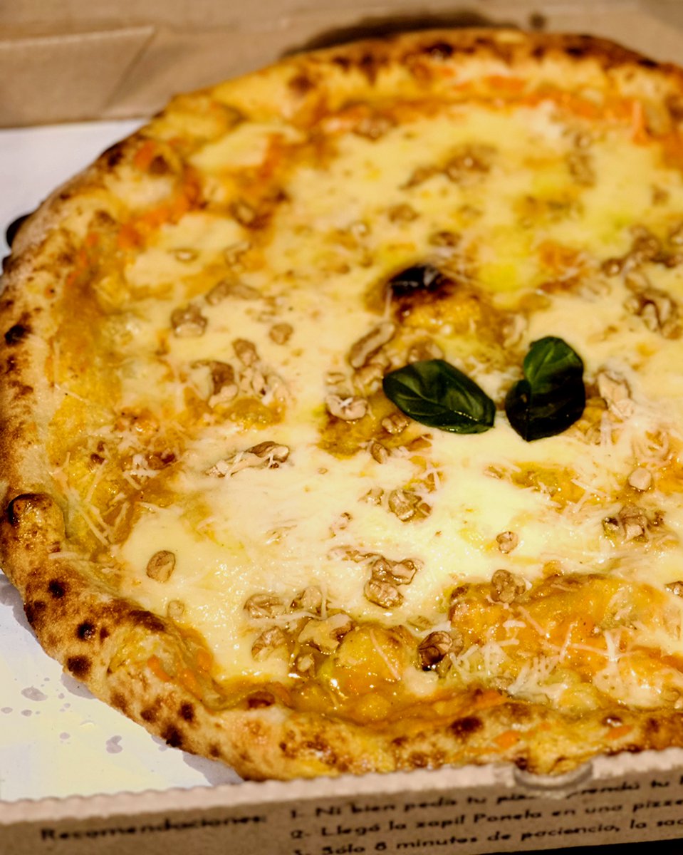 Para los vegetarianos: la de Calabaza. Gran opción. Con salsa de calabaza ahumada mixeada con crema y condimentada, muzzarella, provola ahumada (un provolone italiano más blando), parmesano, nueces tostadas, albahaca y aceite de oliva. 10/10, buenísima.