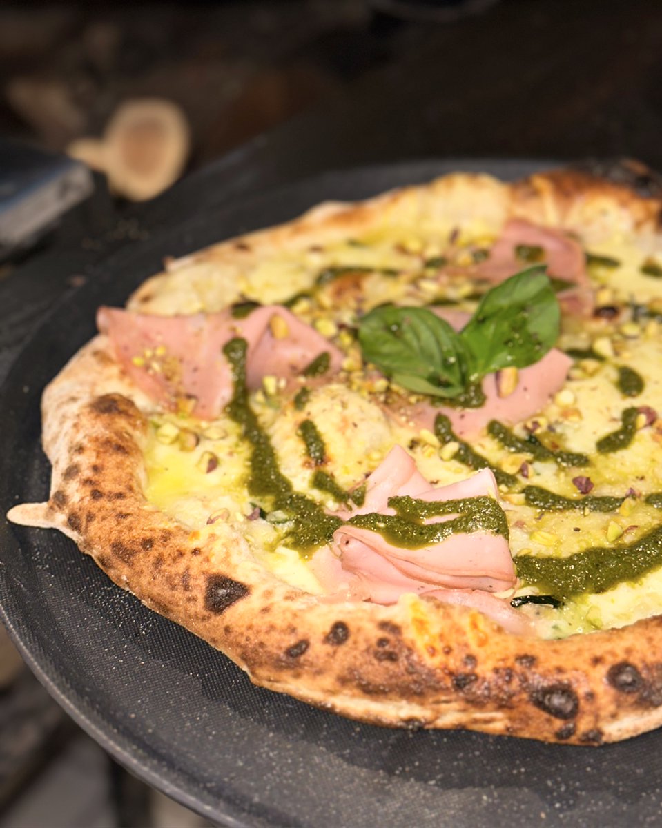 Yo probé la Mortadela con Pistacho que estaba mortal. De base le meten una mezcla de muzza con queso crema y lleva parmesano, pistachos posta (hermoso crunch) y la termina con un pesto de rúcula, albahaca, perejil, nuez y oliva.