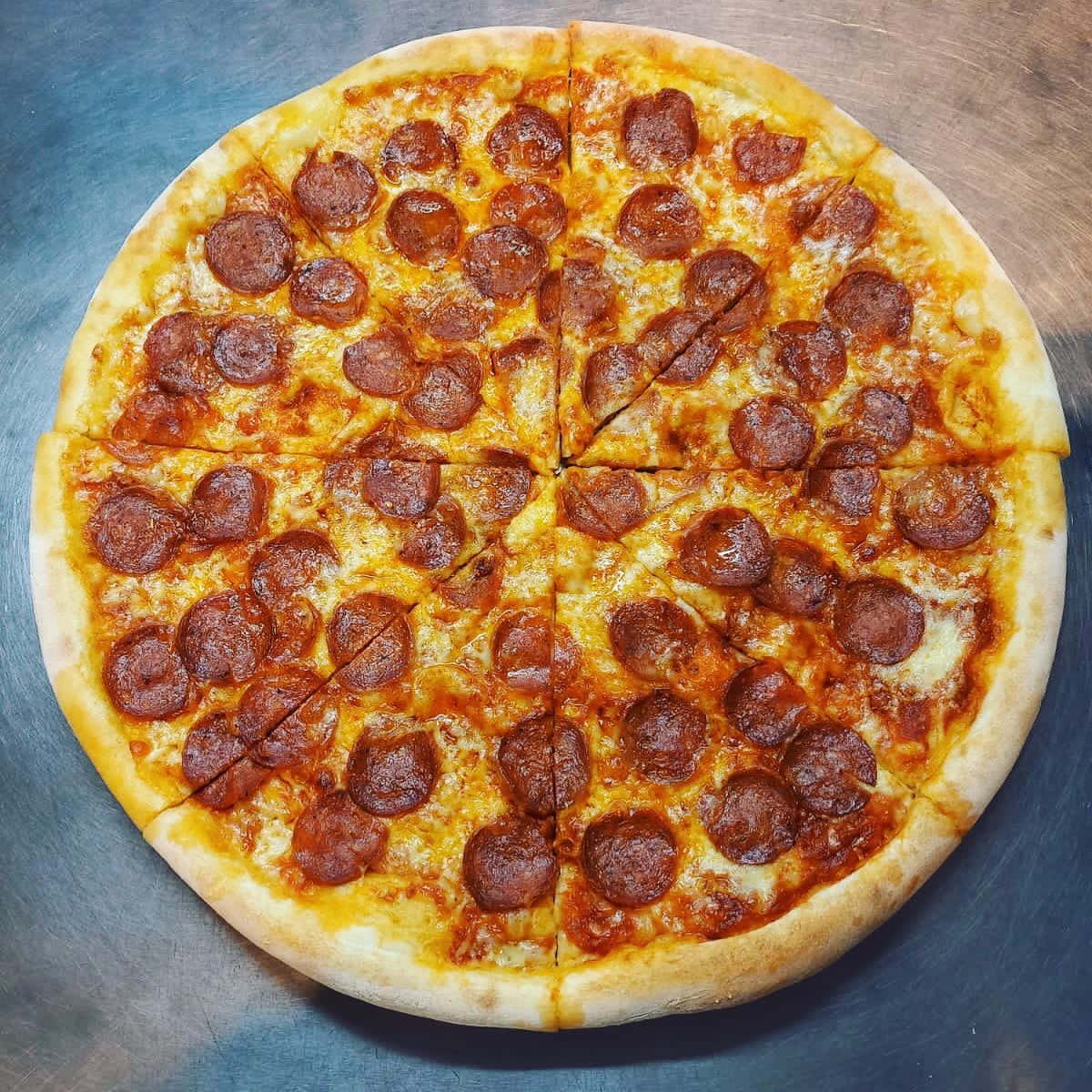 Estética vintage. Pizza media masa, molde redondo, 8 porciones. Gustos simples: muzza, especial, anchoas, fugazza, napolitana. Masa casera amasada a mano, levada naturalmente, y salsa propia. Bollo liviano, y mucho queso: 400 g por pizza.