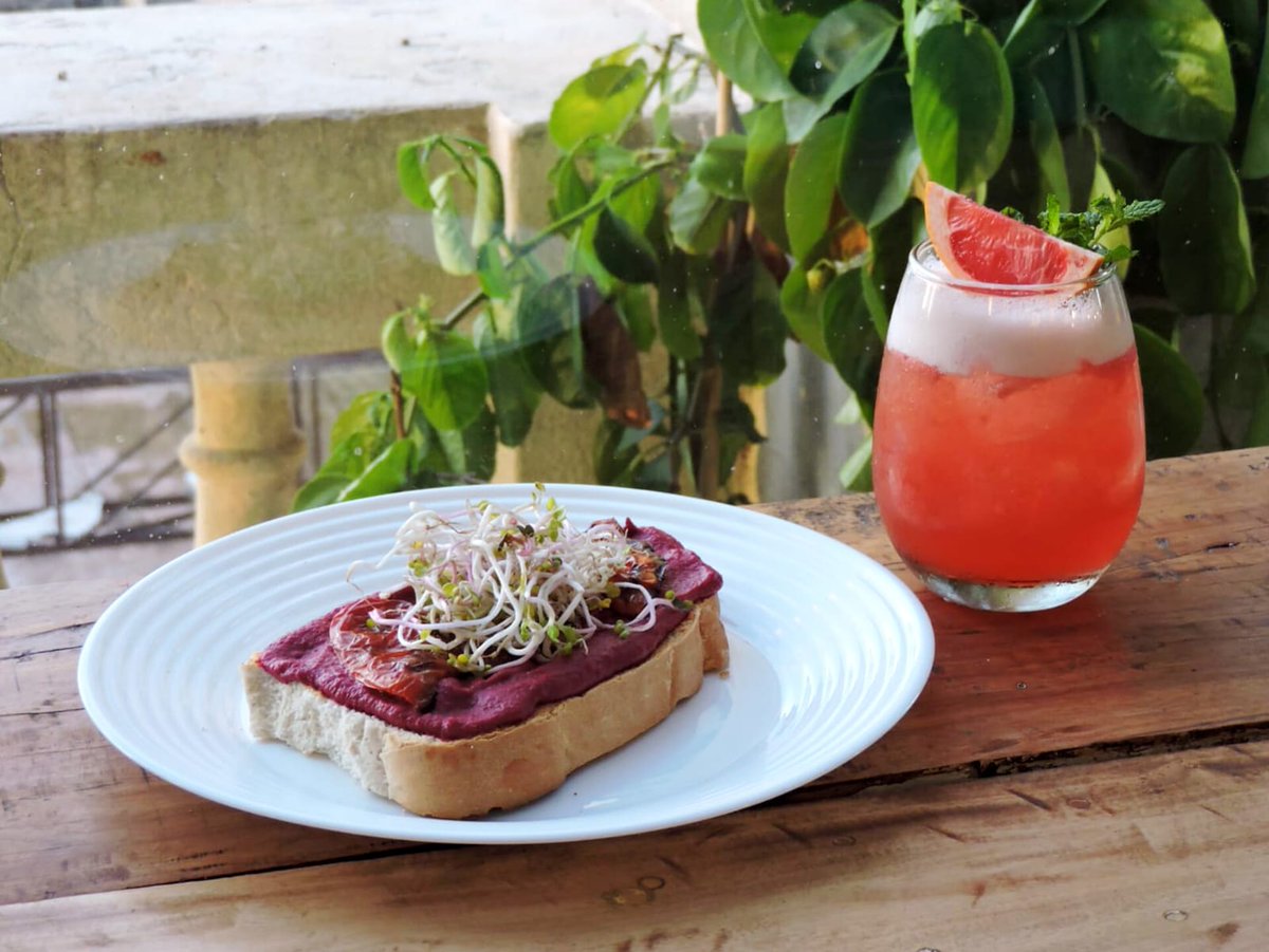 Nosotros comimos una bruschetta veggie, con hummus de remolacha, morrones asados y brotes de soja.