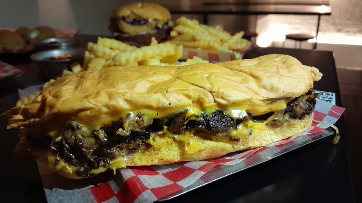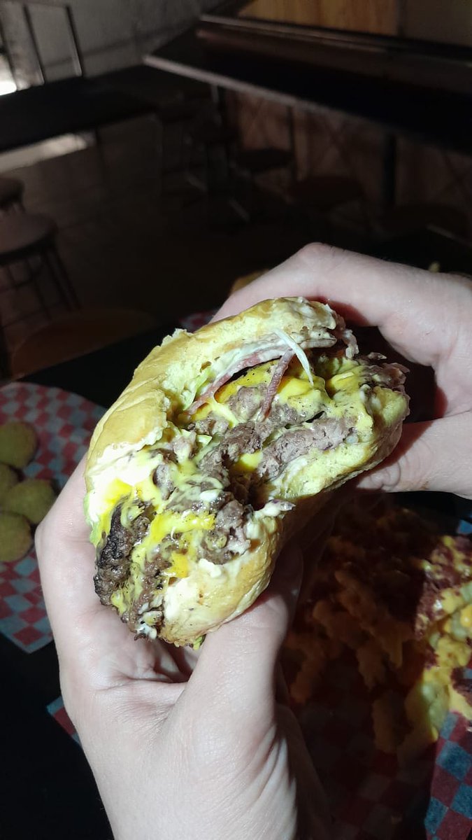 PHILLY CHEESESTEAK. Pan de papa, cheddar x6 (leíste bien), entrecot y cebolla salteado. Me sorprendió que suele tener la carne desmechada y no, los pedazos son grandes y se pueden morder. Distinto, original. Riquísimo.