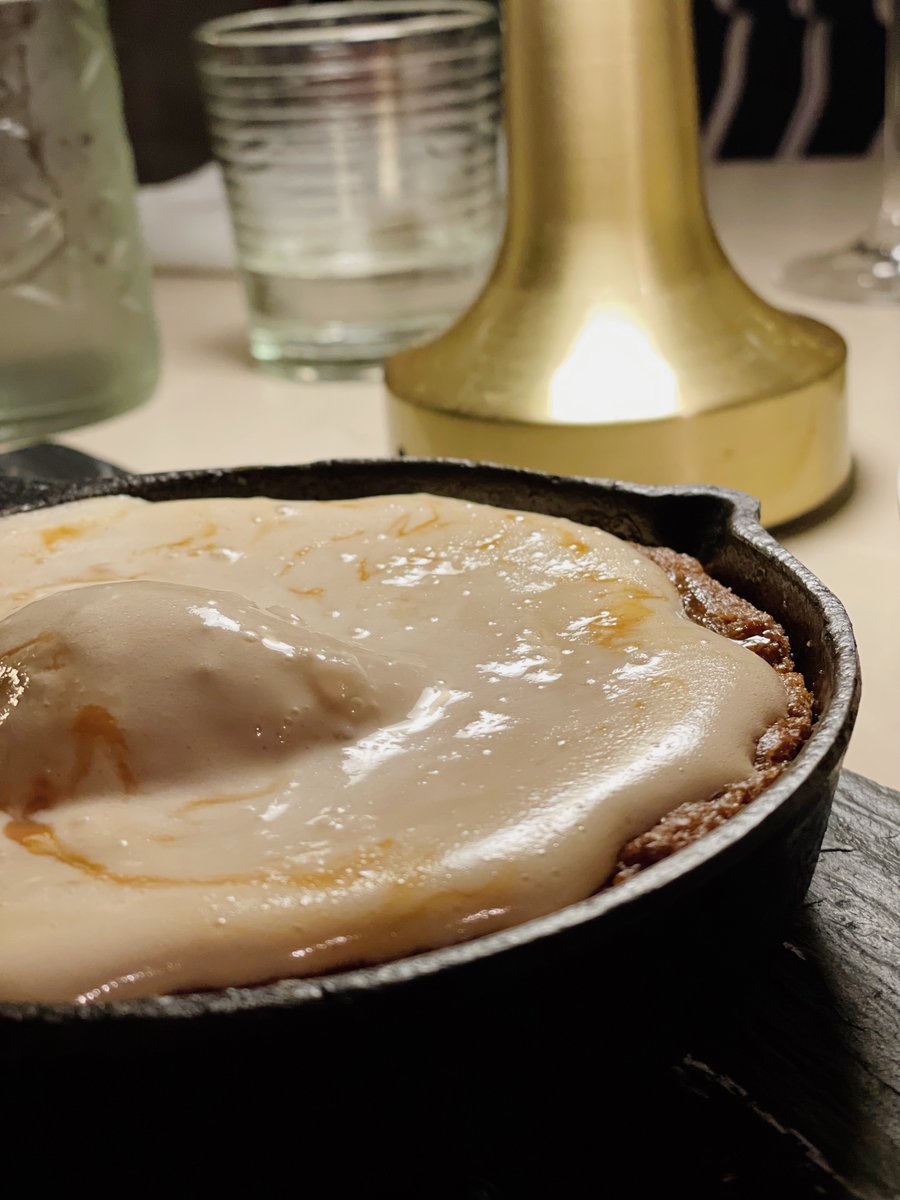 Pero mi postre preferido es este: cookie de chocolate con sal marina y helado de caramelo. Te la traen caliente a la mesa y el helado se va derritiendo. La combinación dulce/salado con la suavidad mantecosa de la cookie… ufff. Una vuelta de tuerca al viejo brownie con helado.