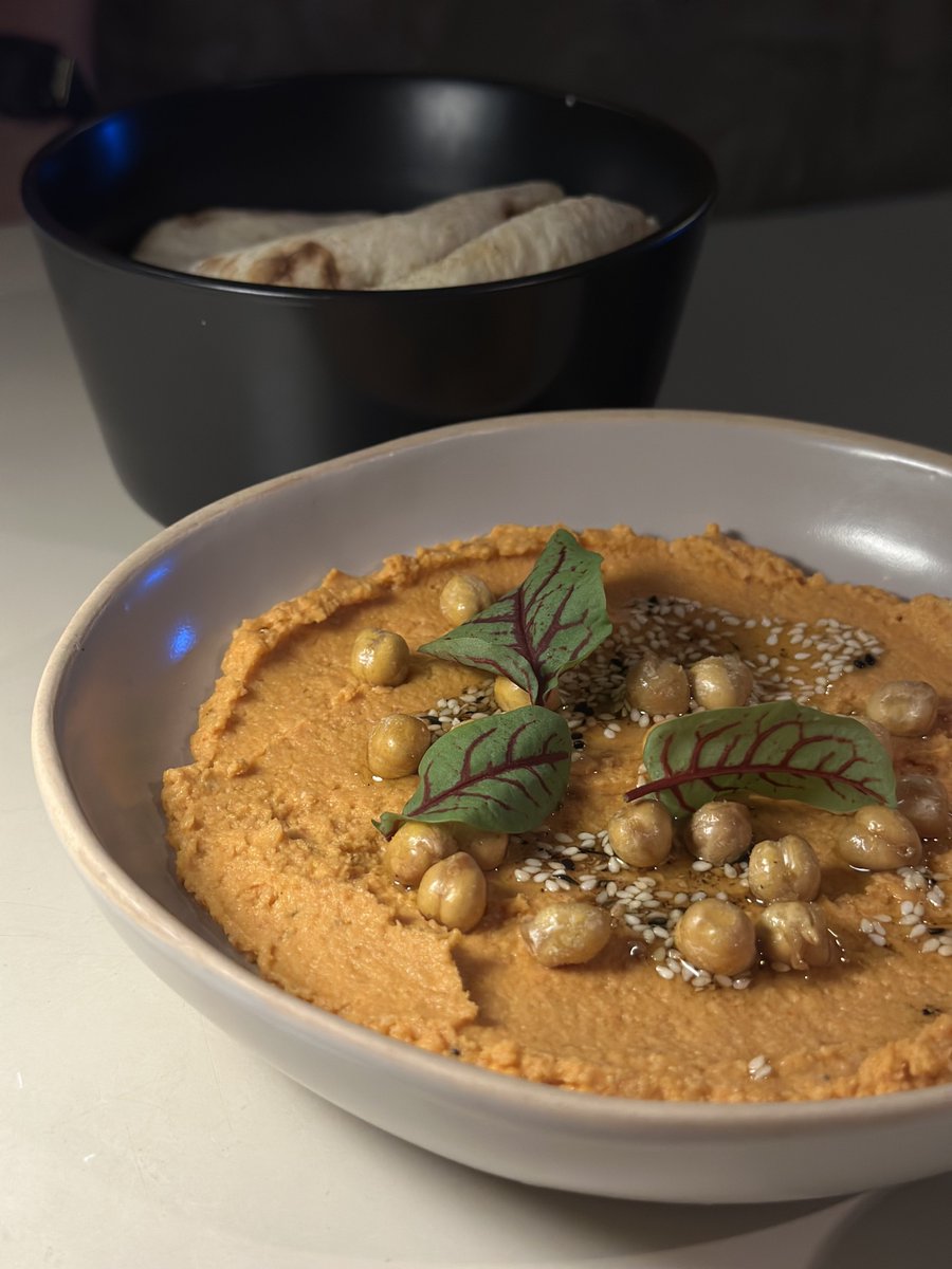 La propuesta gastronómica además, está a la altura. El chef trae recetas de cocinas étnicas y las reversiona con la materia prima que se consigue en Rosario. Este hummus de pimientos rojos, con aceite de zaatar y garbanzos fritos es un buen ejemplo. El pan pita para mojar, gol.