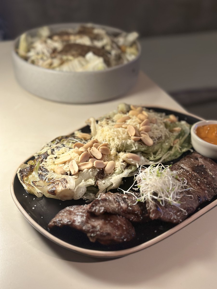 Muy buena tambien la entraña, macerada en algun condimento que no logre identificar. El side era una lechuga asada con maní, queso y salsa arrabiata. No soy fan de la lechuga caliente, pero la comí. No estaba mal. Rico plato. Bien presentado.