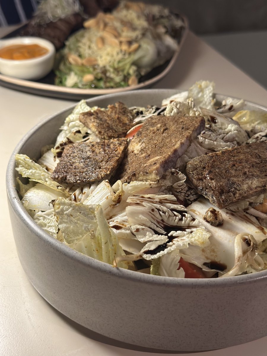Yemi ama este lugar porque tienen muchas opciones veggie copadas. Ella comió esta ensalada de akusai, brotes de soja al curry, tomates cherry, tofu grillado y una reducción de salsa de soja. Tenía algún ingrediente más pero lo olvide.