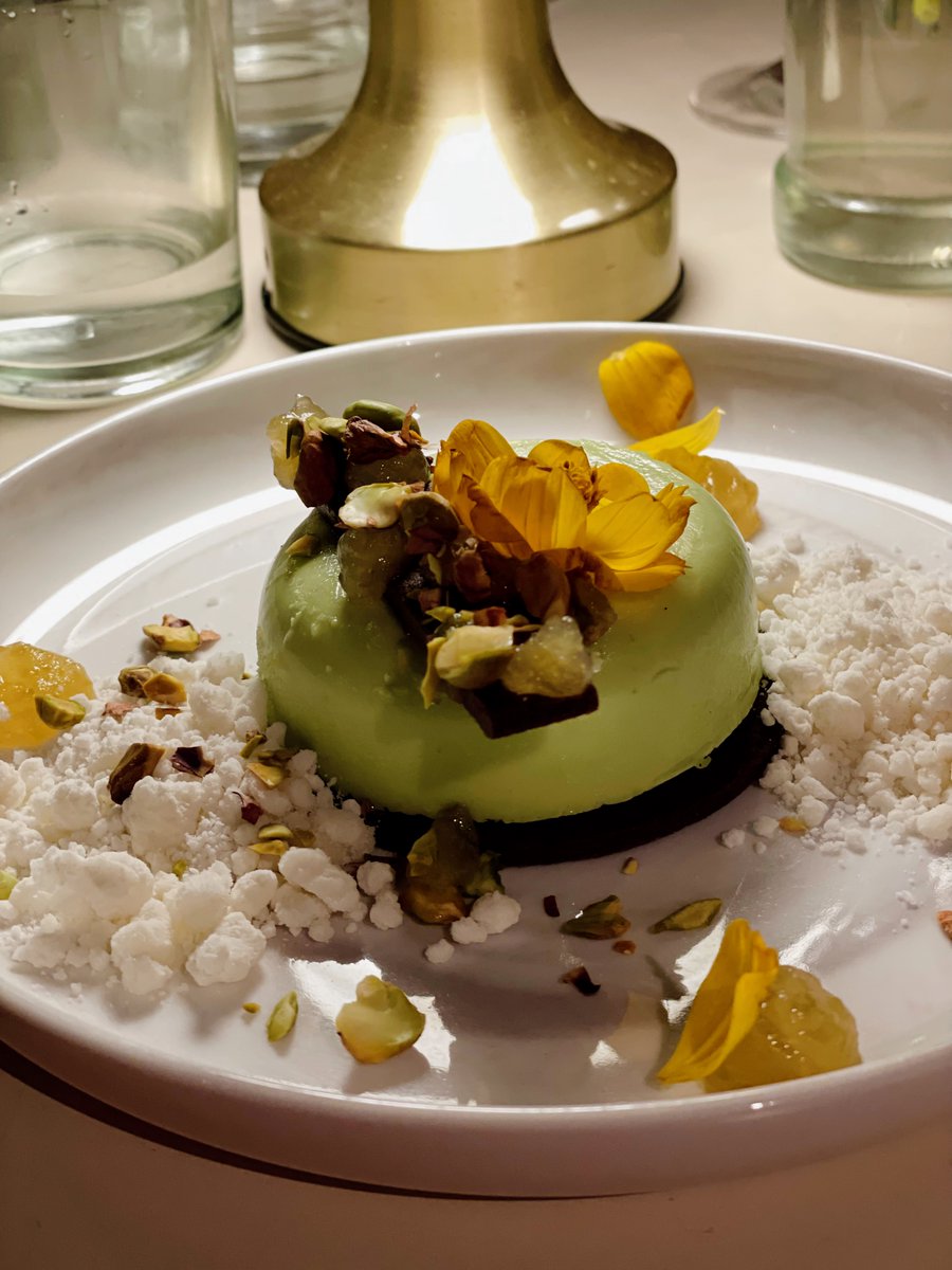 Los postres son una obra de arte. Melani Bellanti se llama la pastelera, siempre hace cosas nuevas y medio alocadas. Esta es una bavaroise de pistacho sobre masa sablee de cacao, con tierra de chocolate blanco y gel de manzana. La combinación en la boca, un escándalo.