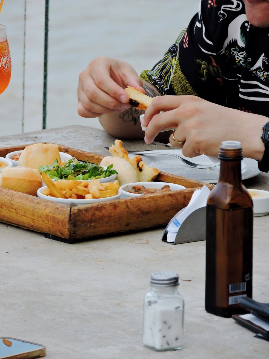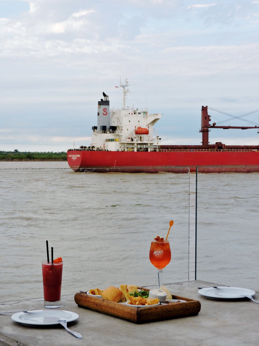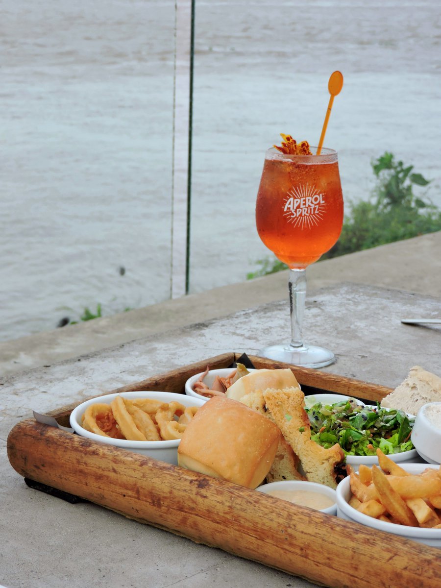El Aperol Spritz (hecho con Aperol y el spritz de Cinzano) está 6 lucas y no sabés como garpa en una mesita con el río de fondo mientras pasa un barco. El Daikiri de frutilla con ron Bacardi $5.500