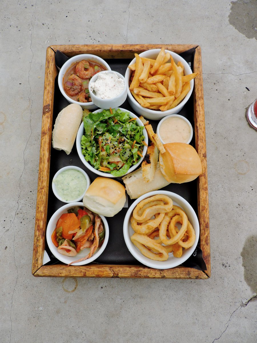 Muy interesantes las tablas. Nosotros pedimos la Tabla Davis: rabas, langostinos al ajillo, escabeche de mar papas fritas y ensalada. $20.500 Viene con salsa tártara, una mayo con perejil y focaccia.