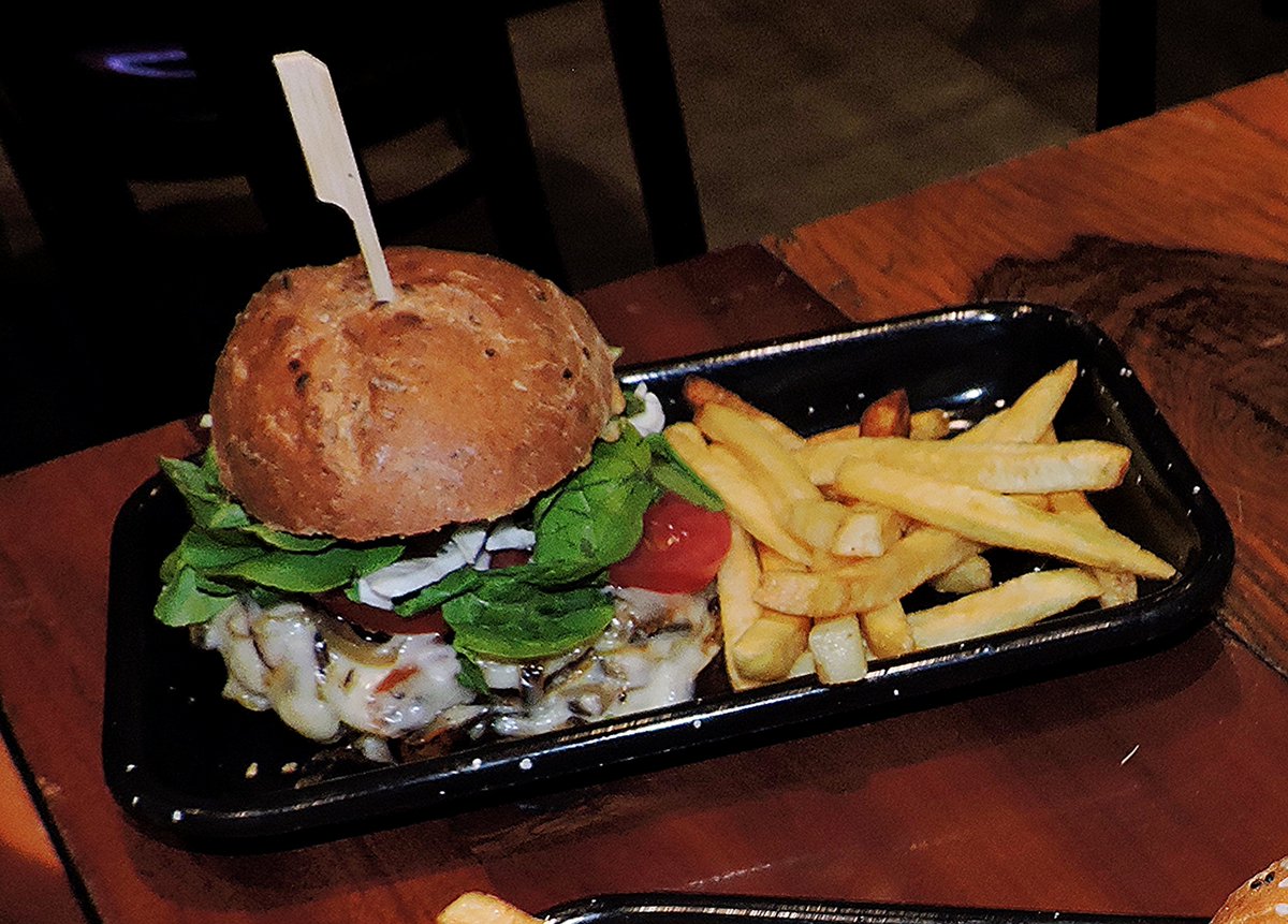 El sandwich vegetariano estaba muy bien: pan de semillas, pimientos, zucchinis, tomate, berenjena, queso tybo, rúcula, repollo y hummus. Con papas $10.500. También va a pasar a brioche.
