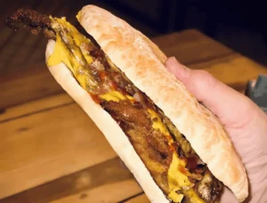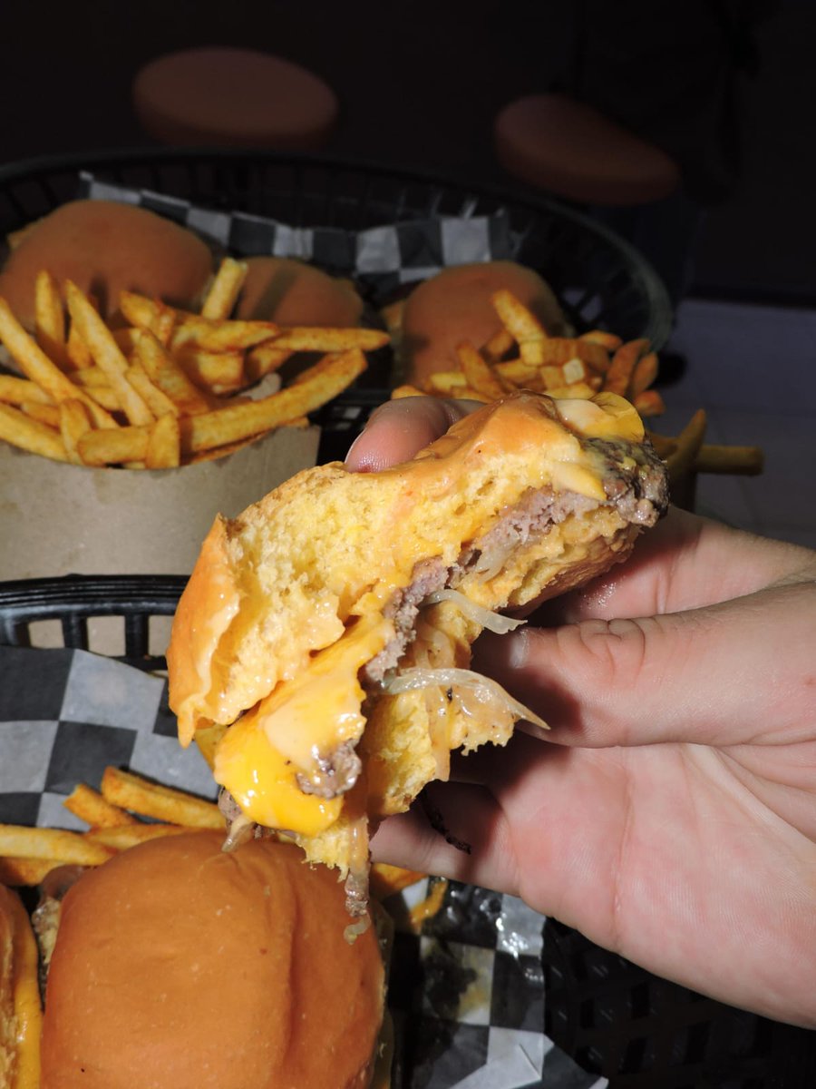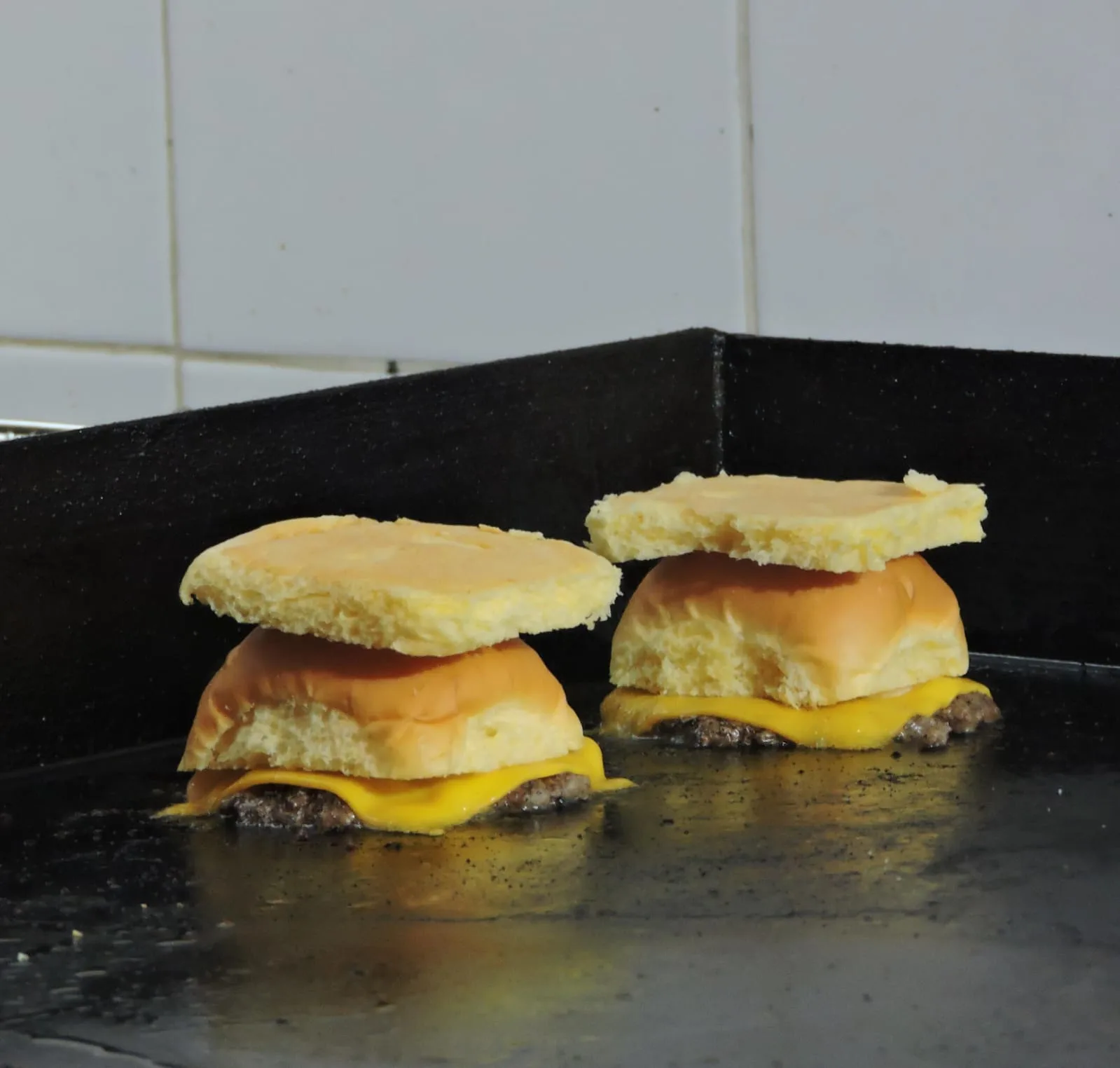 La slider tiene un proceso de cocción particular: ponen la bola de carne, la cebolla arriba y la aplastan. La dan vuelta y la vuelven a aplastar. Después va el cheddar. Y un aderezo. Y le ponen los pancitos arriba. Cuando la sacan, la dejan unos segundos envuelta para que el pan tome los jugos y se humedezca.
