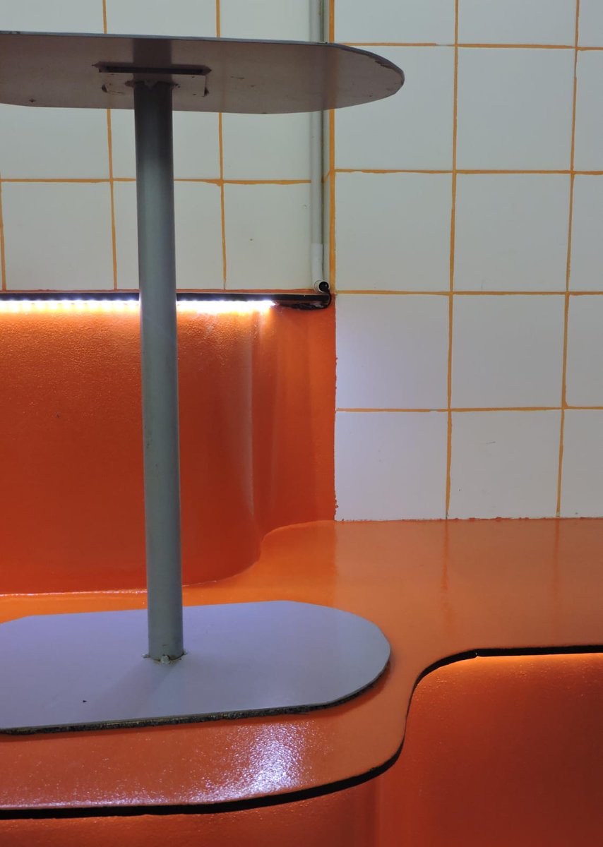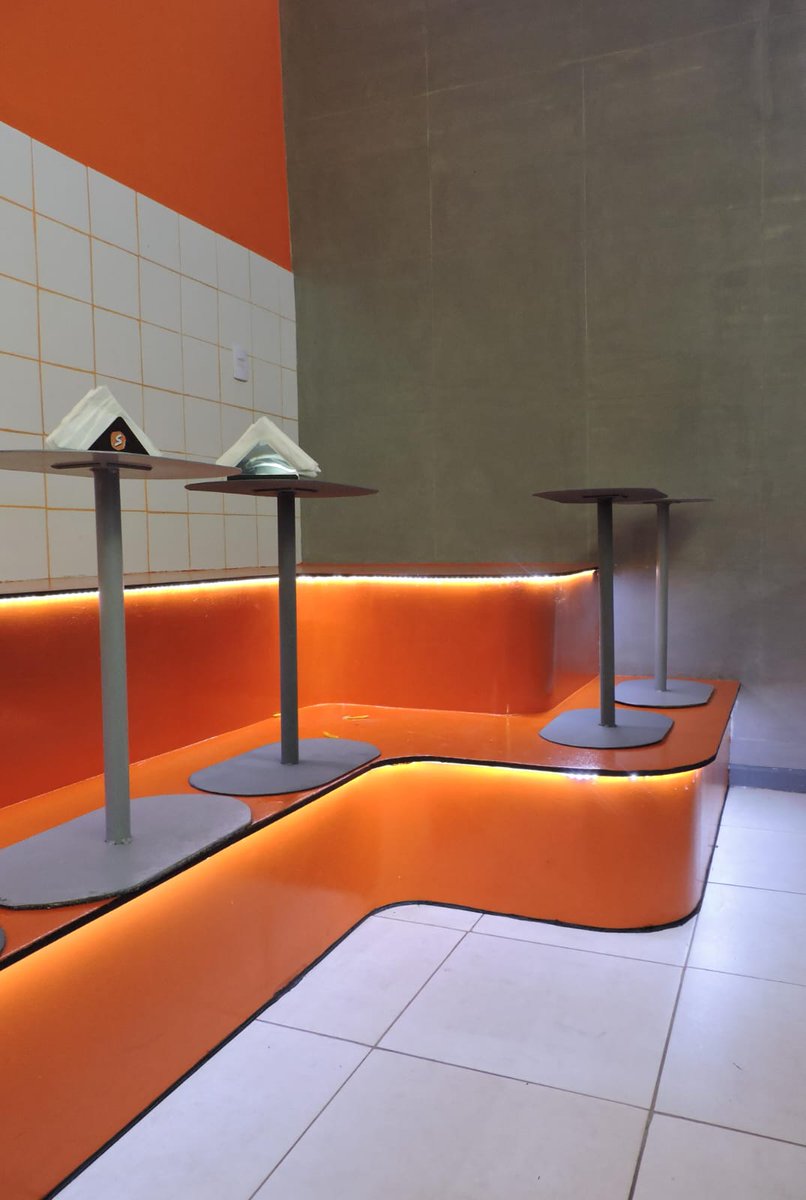 Ambientación: el lugar busca jugarla con un estilo cool y urbano. Te sentás a esperar y comer en una especie de grada de frente a la barra y las planchas donde se hace todo. Esta todo a la vista. Suena hip hop. Predomina el naranja pelota de basket y gris industrial. La canastita en la que viene es bien yanqui. Como si estuvieras viendo un partido.