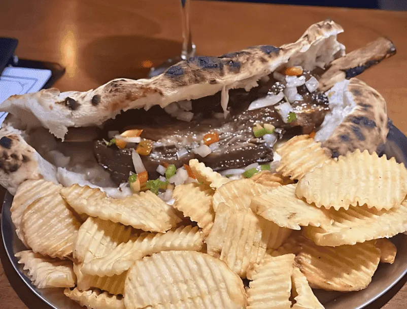 Básicamente es un pedazo de costillar adentro de una masa de pizza, con muzzarella, provoleta y salsa criolla. Viene con unas papas rejilla divinas. Un poco difícil de comer, pero valiente y voluptuoso. Muy bien lo de Terco.