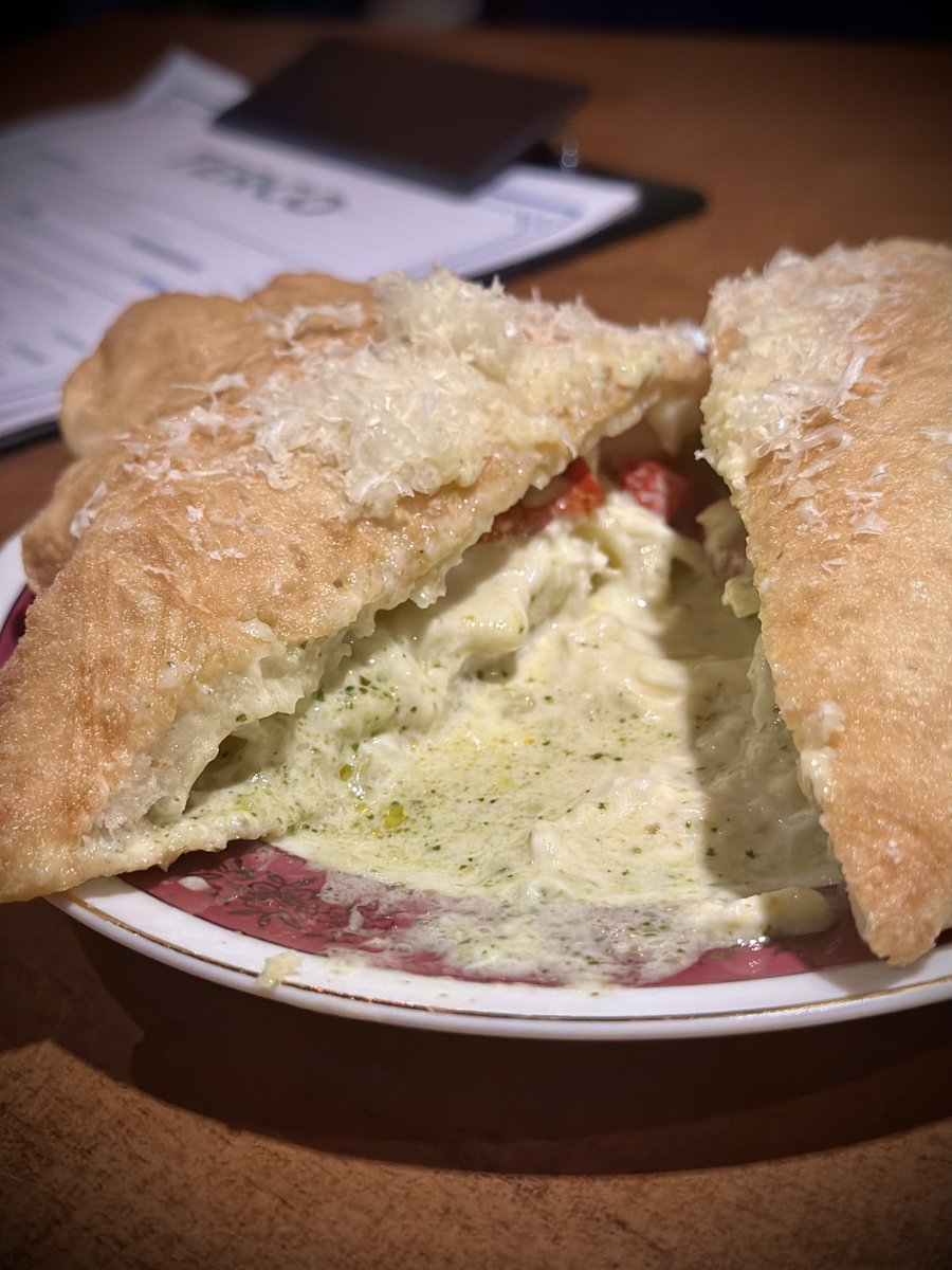Las entradas están buenas. Hay un cono frito de masa de pizza relleno de stracciatella (el relleno de la burrata, como una crema de queso), morrón asado, pesto y parmesano bastante original. Me dijo que sacó la idea de un chef italiano. Rico rico.