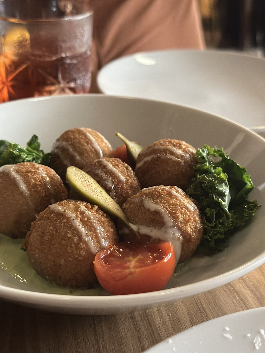 3) La propuesta es cocina de estación, con la impronta del chef Juan Cimino (estuvo en Sunderland y el desaparecido Rico Bistro. foto: croquetas de pesca del día (creo que era mero) con salsa romesco, jale y cherrys.