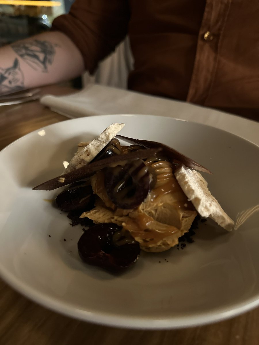 10) Yo pedí uno que pensé que iba a ser empalagoso pero no. Cremoso de dulce de leche, merengue, cerezas pochadas, unas láminas que parecían hostias de chocolate y una salsa toffee de whisky. Rico. Todo tiene muy poca azúcar, entiendo que para apreciar mejor los sabores.