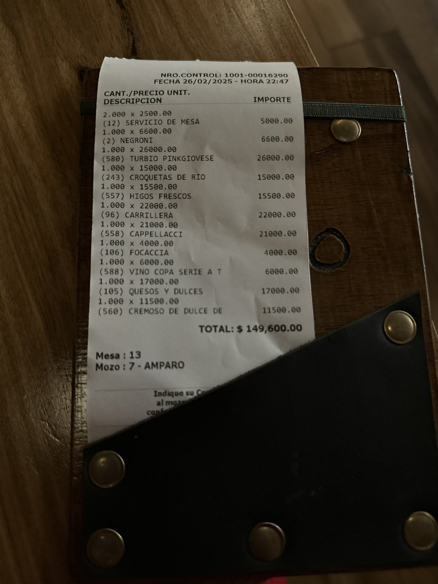 12) Llegó la hora de la verdad. Todo esto que mostré (más un negroni y una copa de chardonnay) salió casi 150 lucas. ¿Qué opino yo? Comimos y bebimos muy bien y no escatimamos en nada (dos entradas, dos principales, dos postres, vino, tragos). El nivel de cocina es alto. El lugar es muy agradable. La atención es de excelencia. Son valores fuertes para Rosario. Pero quizás la propuesta valga la pena. Cada uno verá si quiere o puede pagarla. Pero tiene que existir esta oferta. Sube la vara de la ciudad. Una última observación: si cobras servicio de mesa no cobres la reposición de panera. Baja el nivel del lugar.