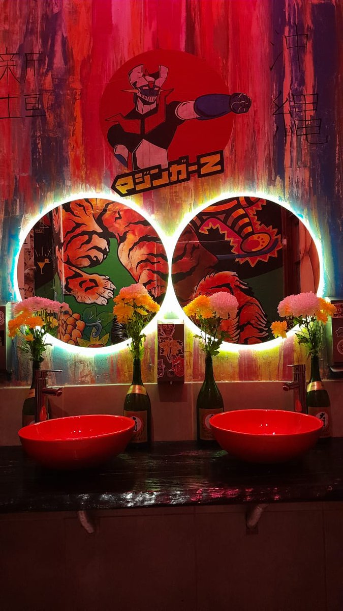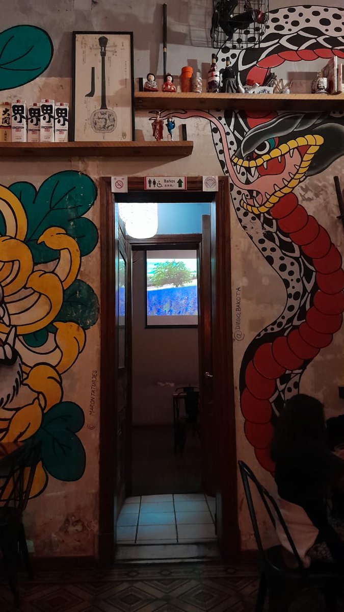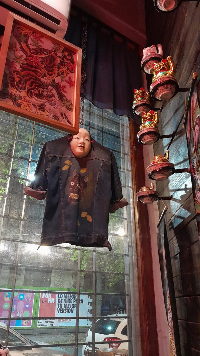 Está todo pintado, decorado, lleno de muñecos, productos japoneses, pinturas, grafittis, máscaras, adornos y parafernalia por todos lados, hasta las lámparas, muchas relacionadas a anime, o películas de estudio ghibli.