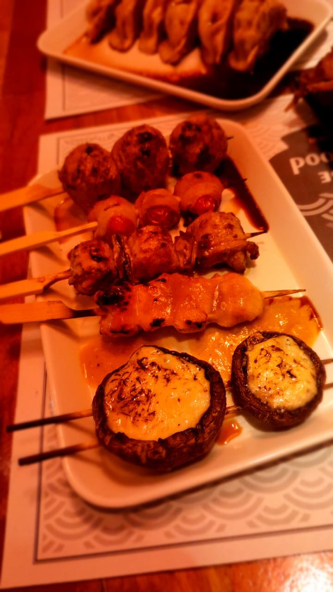 Kushiyaki. Son unos pinchos o brochettes japoneses a las brasas. Pedimos el combo Ryu, que trae cuatro: Mune (pechuga), negima (pollo con puerro japonés), Tsukune (albóndigas de pollo), hongos portobello con queso y uno que creo era de panceta y tomates cherry (?).