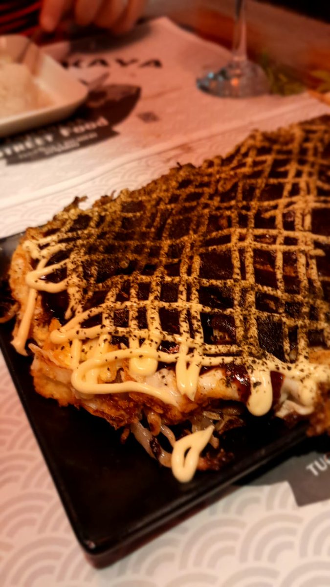 Después comimos Okonomiyaki, es como un panqueque con huevo, repollo, katsuobushi y alga nori hecho a la plancha, regado con salsa agridulce, jengibre y mayonesa.