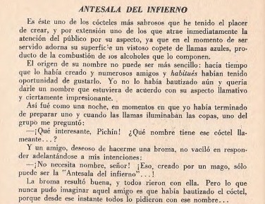 Allí fue que un amigo de Pichín, deseoso de hacerle una broma, lo interrumpió: «¡No necesita nombre, señor! ¡Eso, creado por un mago, sólo puede ser la Antesala del Infierno«. Todos rieron, y el cóctel quedó bautizado: a partir de allí todos lo pidieron con ese nombre.