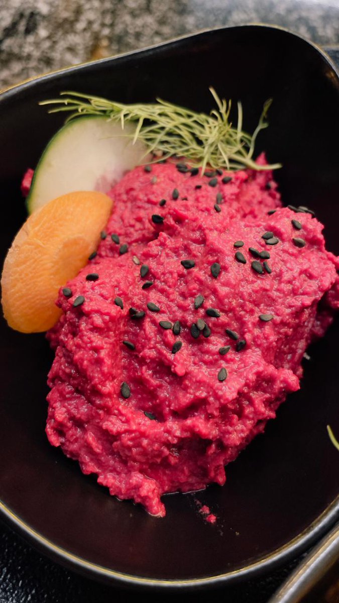Lo que comimos: Trío de hummus. Remolacha. Garbanzo. Pimientos. Acompañado de focaccia y vegetales. Glorioso. La textura es espectacular y los sabores están bien equilibrados. Los colores hacen que entre por los ojos.