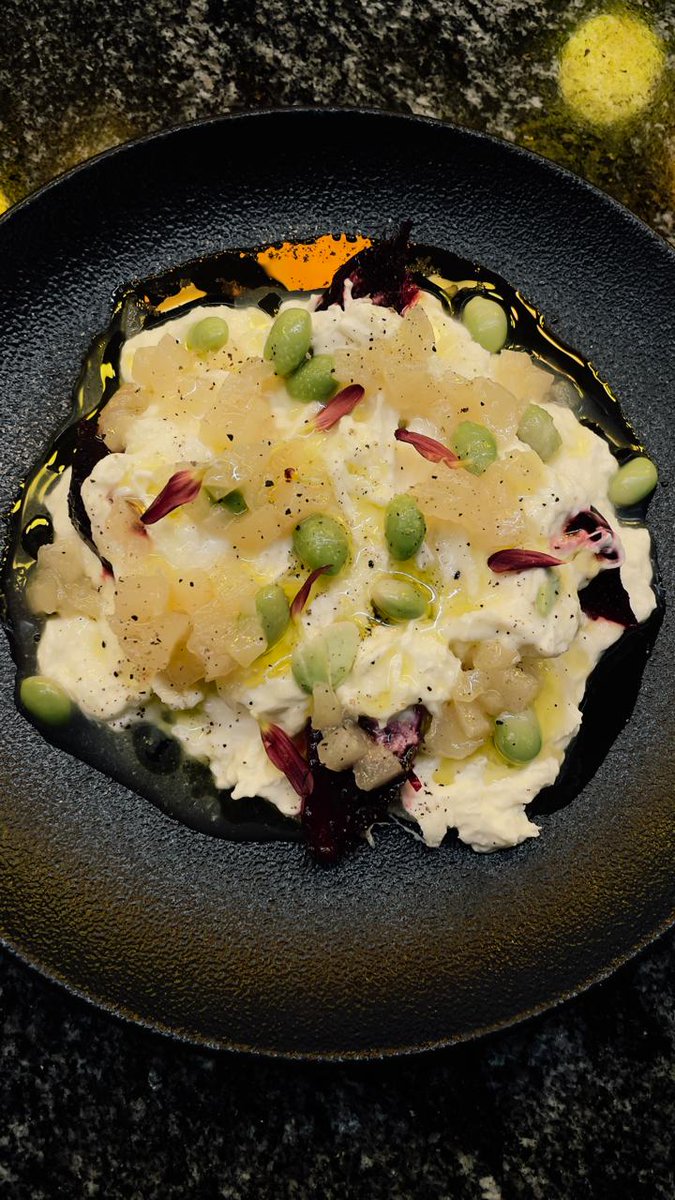 Straciatella, edamame, remolacha y chutney de membrillo. Hay dulce, hay acidez, está el queso que es riquísimo. Una mezcla de notas distintas en la boca muy cautivadora.