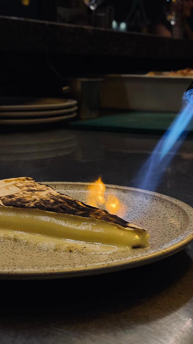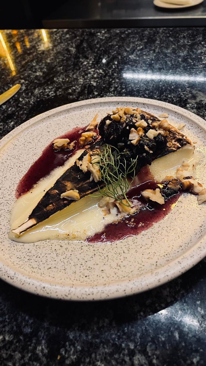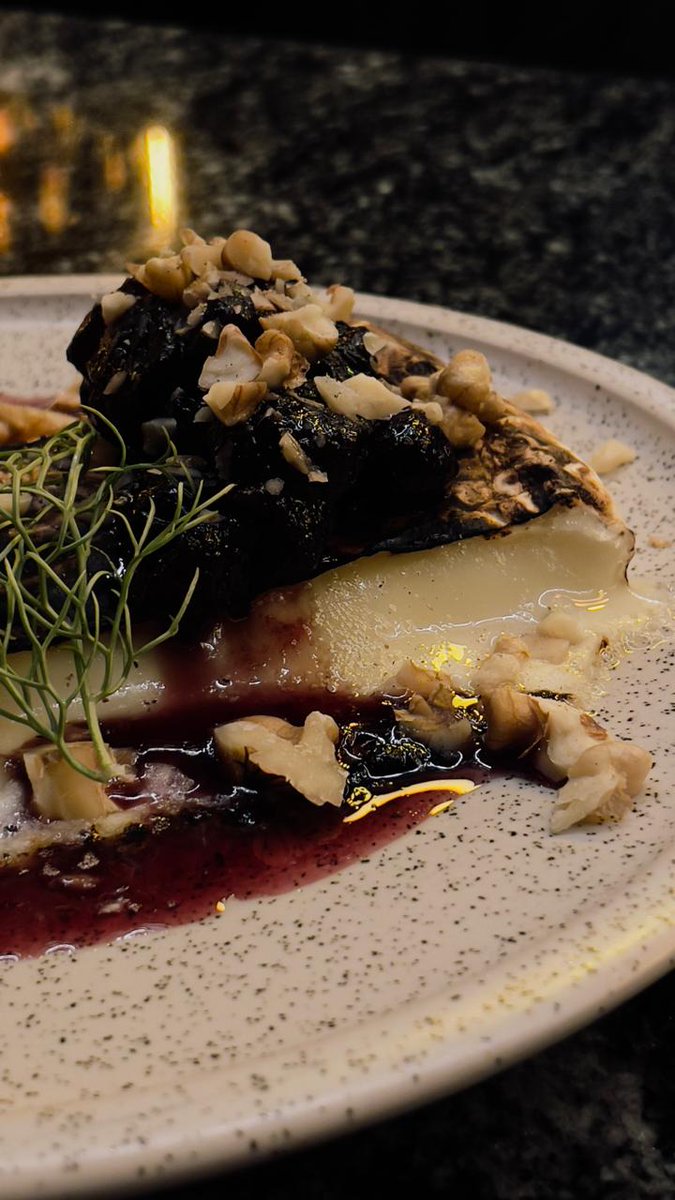 Queso brie flambeado con mermelada de arándanos, tomillo, nueces y pimienta negra. Tiene crunch, tiene suavidad, tiene la nuez y el dulzor. El saborcito a quemado del brie. Una joya.