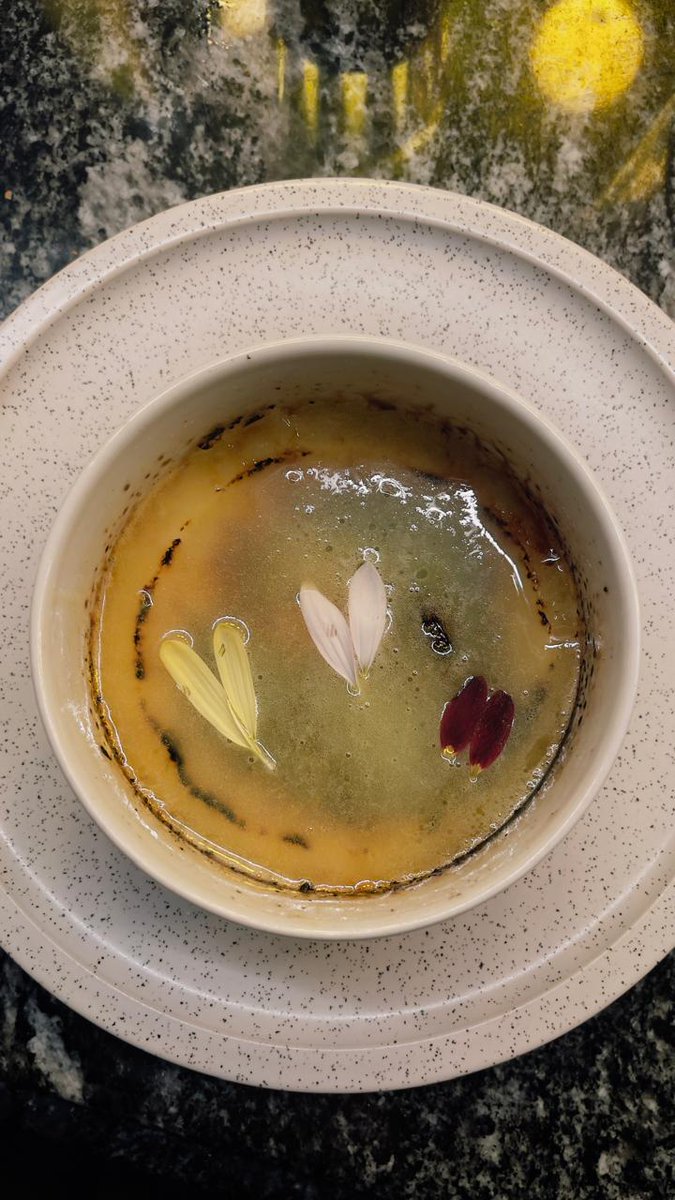 Postre: Creme brulee de chocolate blanco con curd de cítricos. Junto a la costra azucarada de la superficie generaba una interacción enloquecedora en el paladar. 10.