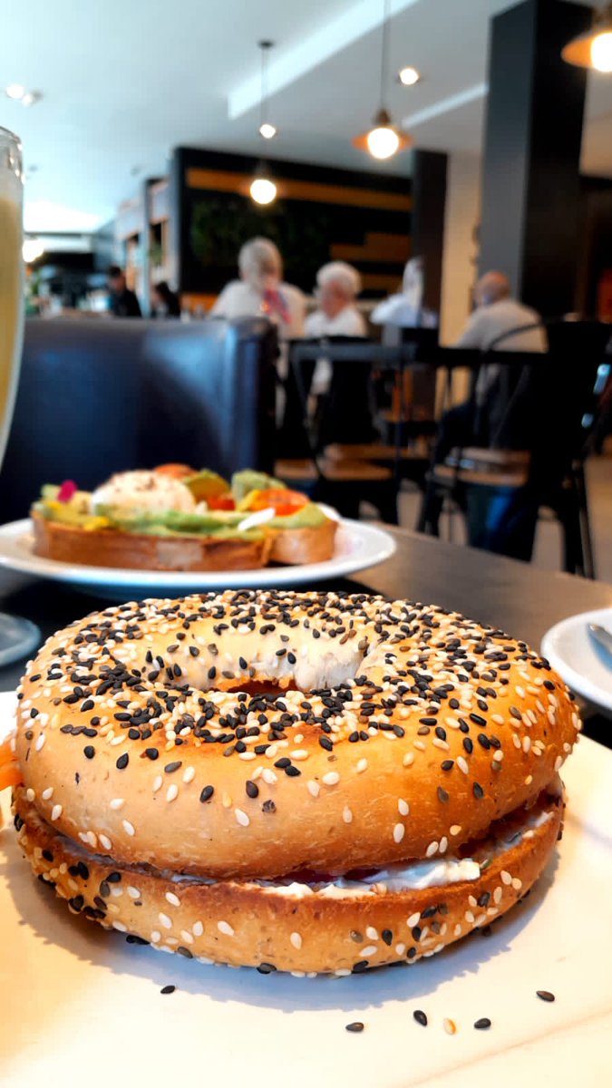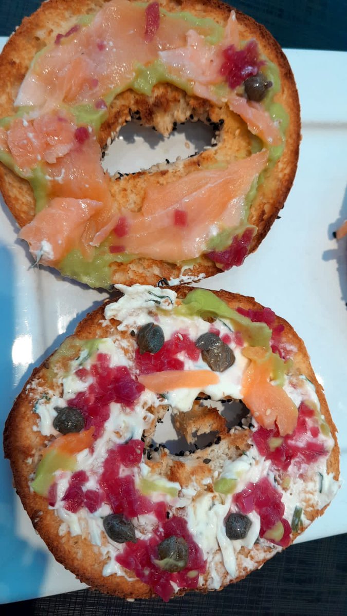 BAGEL DE SALMÓN: salmón ahumado, cebolla morada, alcaparras, queso crema con ciboulette y palta. El bagel es suave al morderlo, está tostado y tiene semillitas de sésamo negro y blanco. La combinación ácida y agria del pickle de cebolla con el salmón, el queso blanca, las alcaparras y la palta es celestial. $3900 (*). Vienen dos, es muy buena la porción.