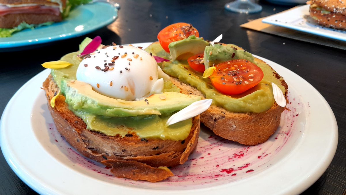 AVOCADO TOAST: tostadas de pan de campo multicereal, palta, tomates cherry, y semillas. $2400 (*) con infusión (con huevo poche + $250). La palta viene en pasta cremosa y también en pedazos. Normalucha. Le faltan más semillas para que haga más crunch.
