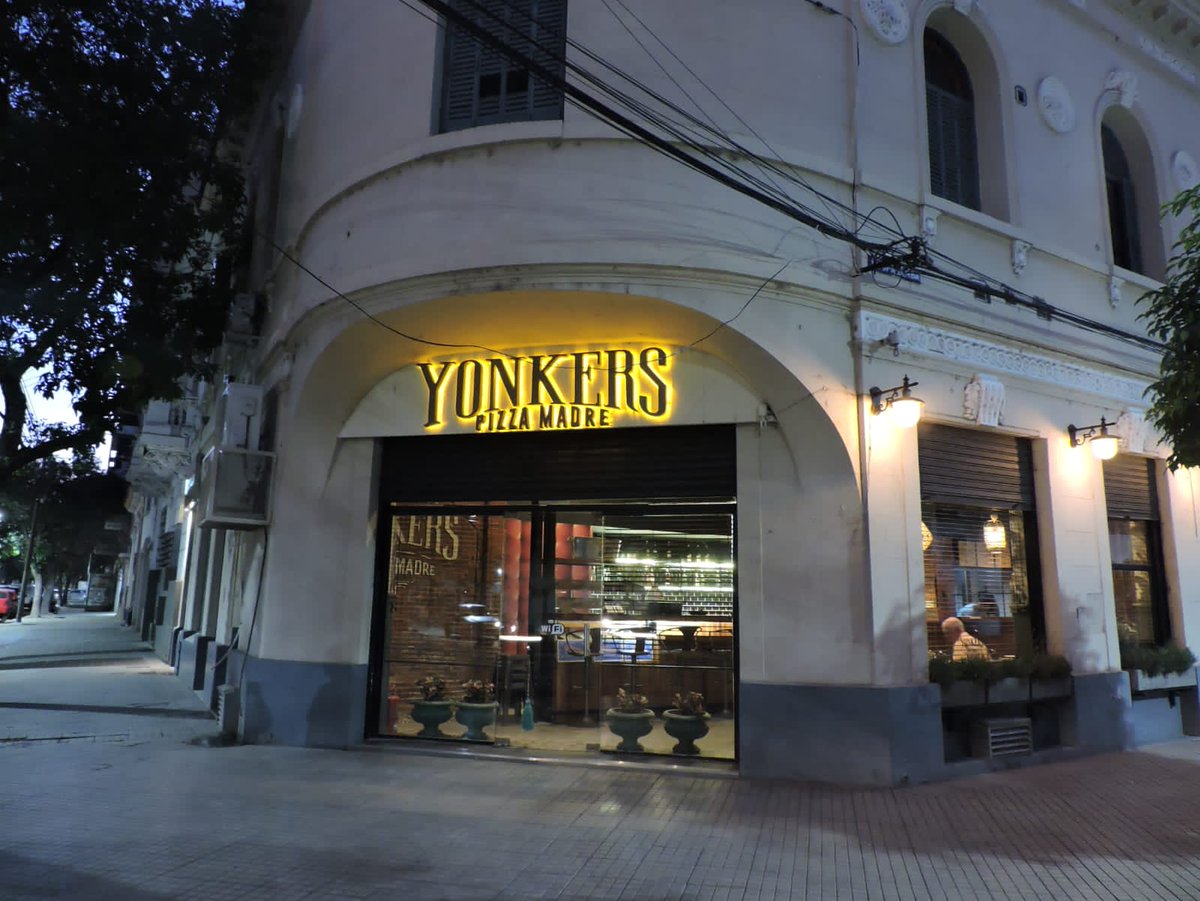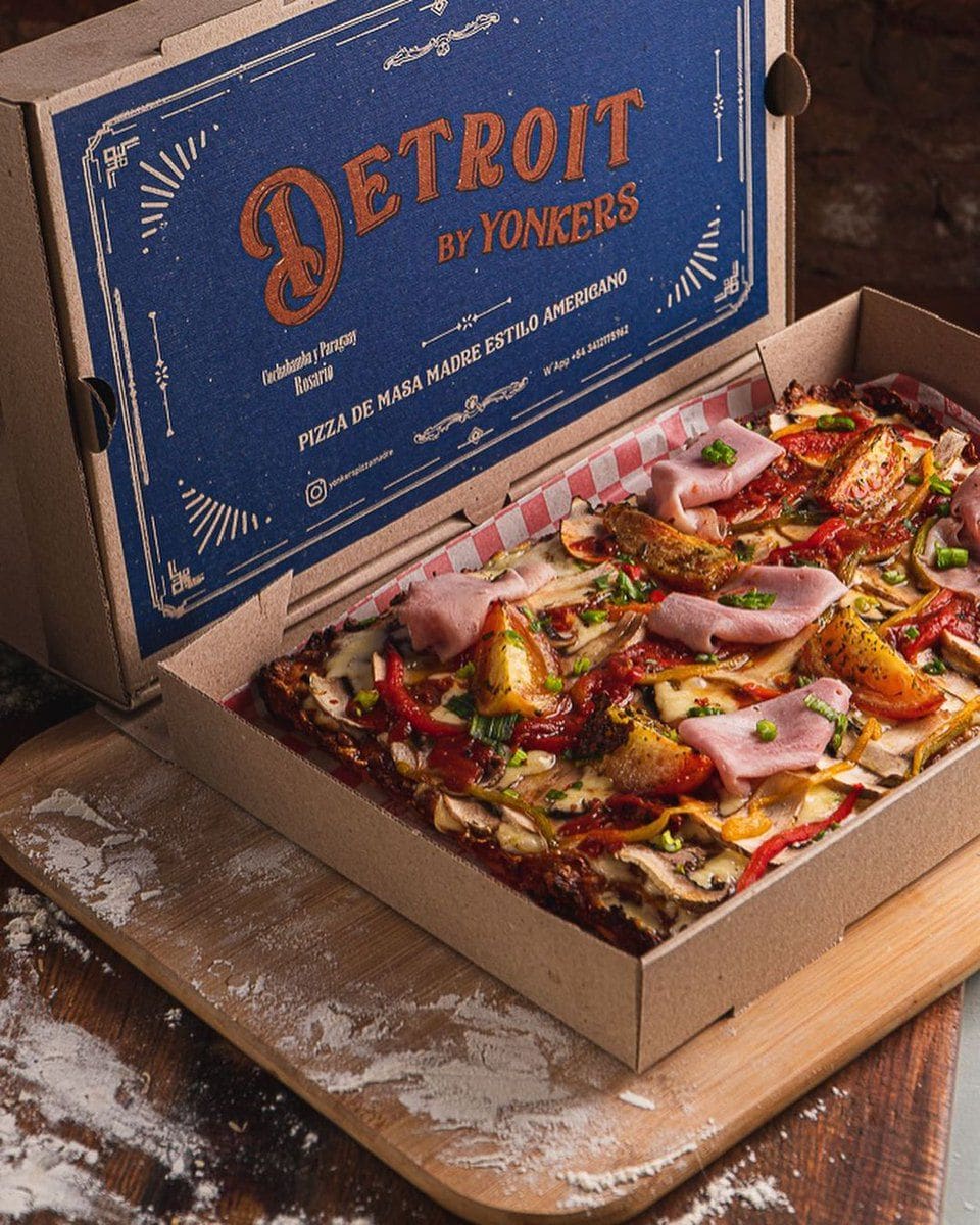 Qué lujo la pizza Detroit de Yonkers (Cochabamba y Paraguay). Cuadrada de masa madre con el borde coronado por un blend de quesos crocante. Esta es la Special Grandma: Muzzarella, morrones, huevo duro, jamón cocido, aceitunas negras y salsa de tomate.