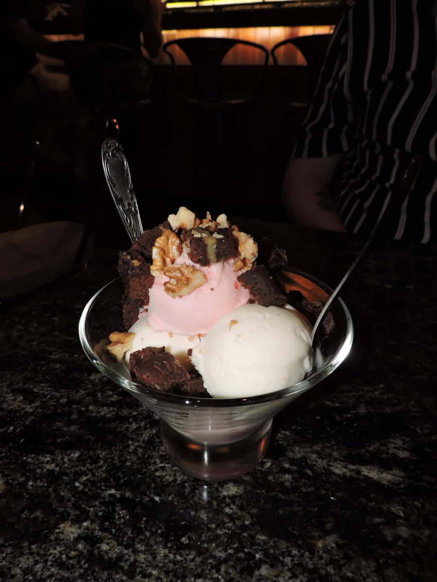 Postre: Copa Yonkers. Helado de americana y frutilla, pedacitos de brownie y nueces. Porque es todo o nada, no vale ir a menos.