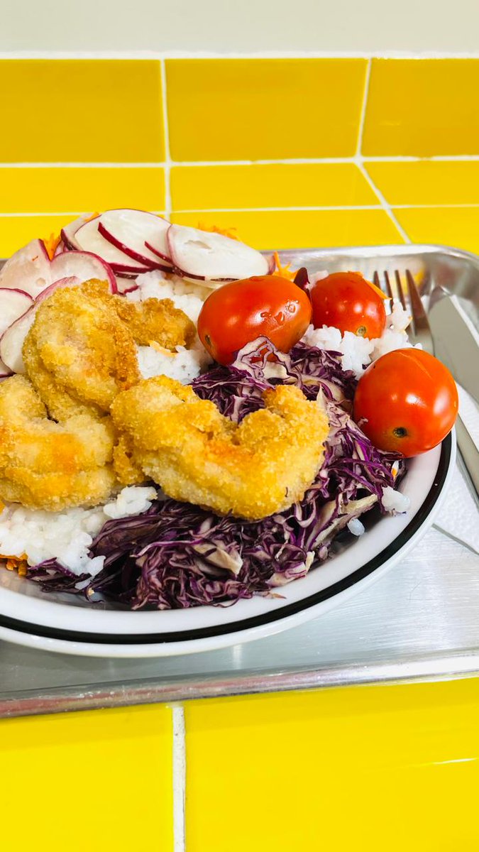 Foto: TOP langostinos empanados con repollo, arroz de sushi, rabanito y zanahoria.